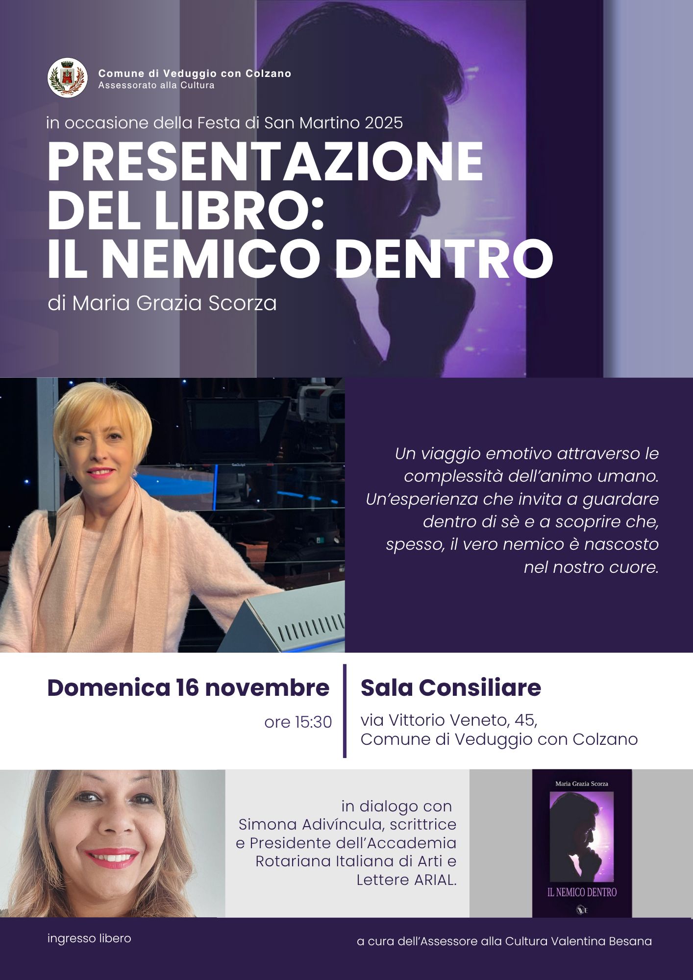 Alle ore 15:30 presentazione del libro "Il nemico dentro" di Maria Grazia Scorza presso la Sala Consiliare del Municipio. Dialogo con Simona Adivincula scrittrice e presidente dell'Accademia Rotariana Italiana di arti e lettere ARIAL